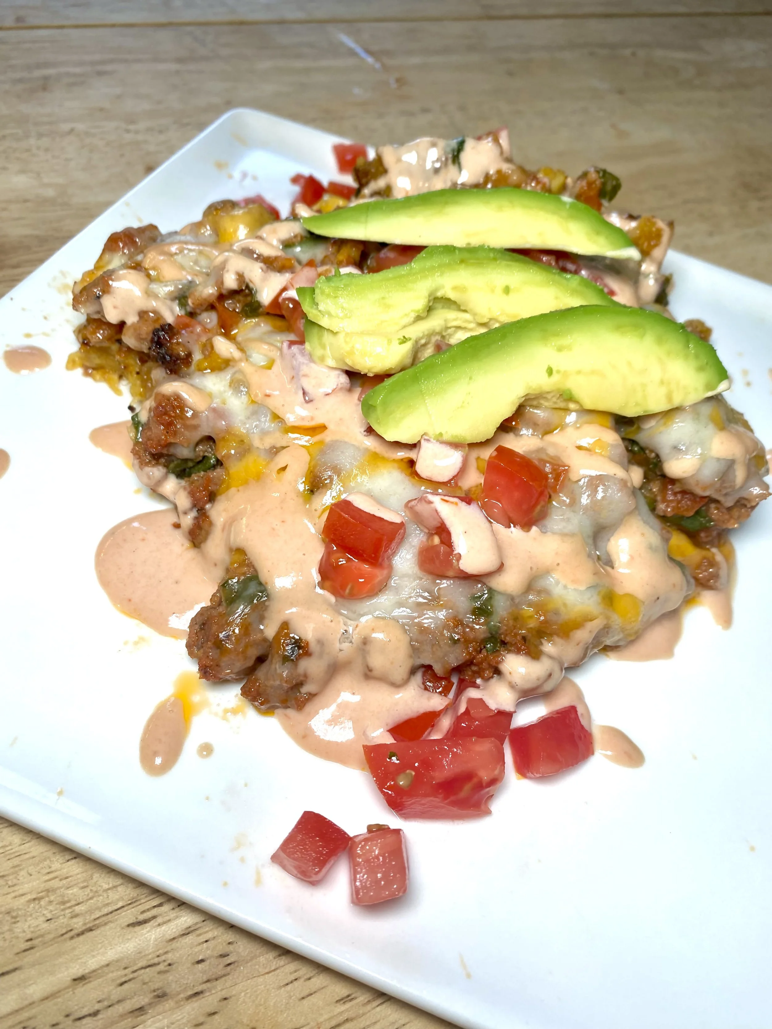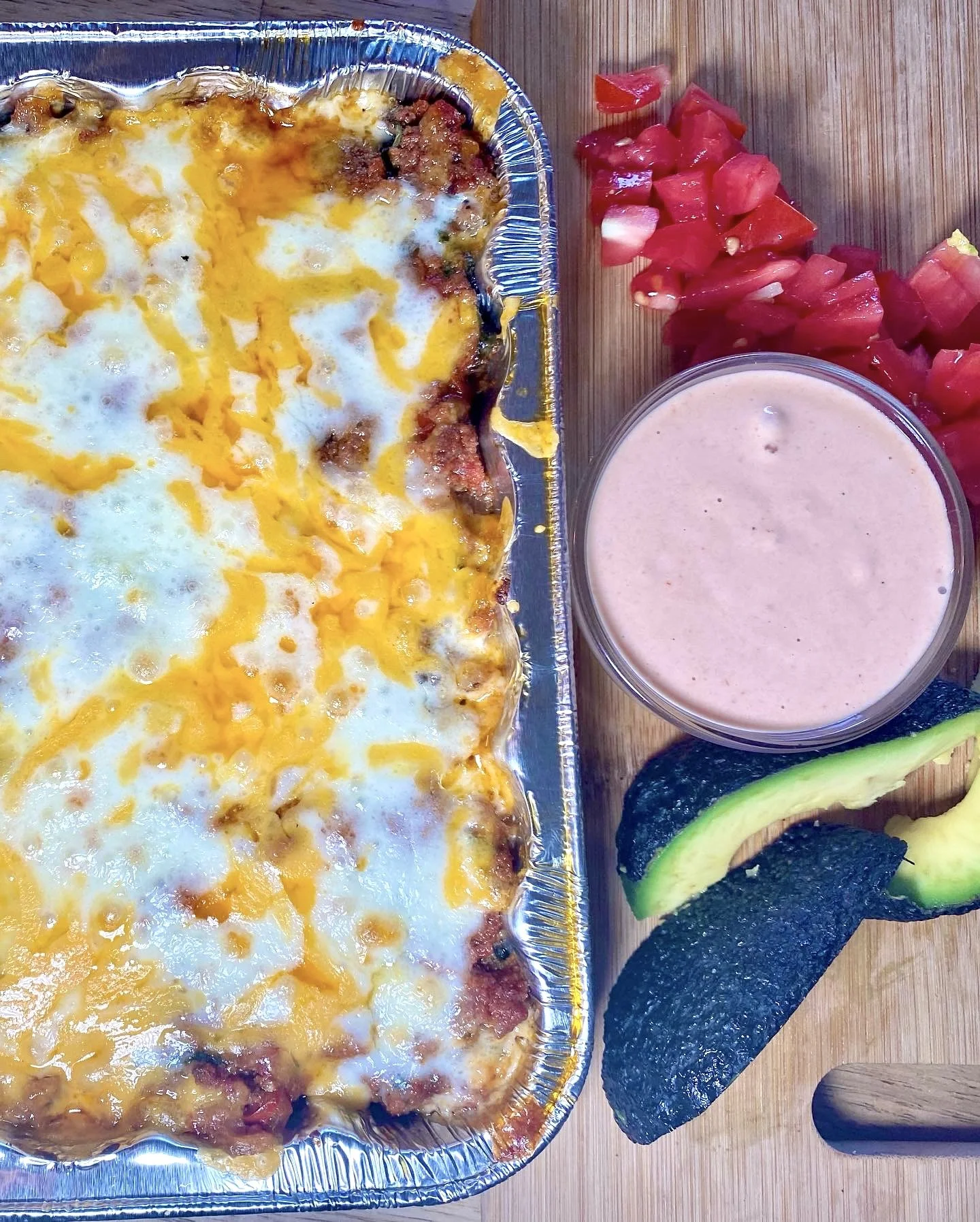 Place casserole in the oven and bake 12-15 minutes, until cheese is bubbly and the edges are crispy. Top each serving with pink sauce, diced tomato, sliced green onion, chopped cilantro, and/or sliced avocado. Enjoy!